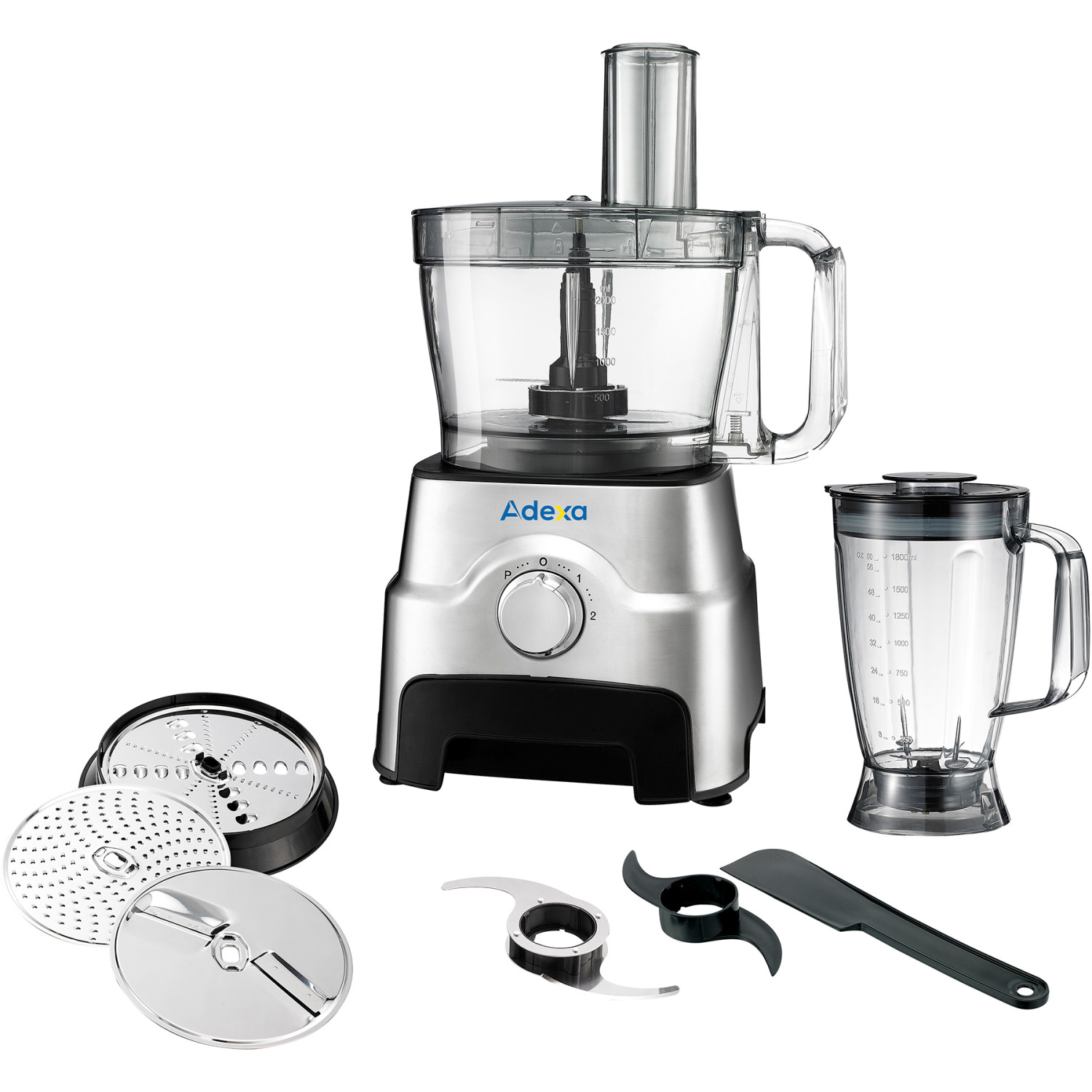 The 1.8L plastic blender jar includes seven attachments: chopping attachment, shredding blade, mixing spatula, dough attachment, medium slicing blade, fine slicing blade, medium grating blade and fine grating blade. All attachments/blades are steel and dishwasher safe for your convenience.