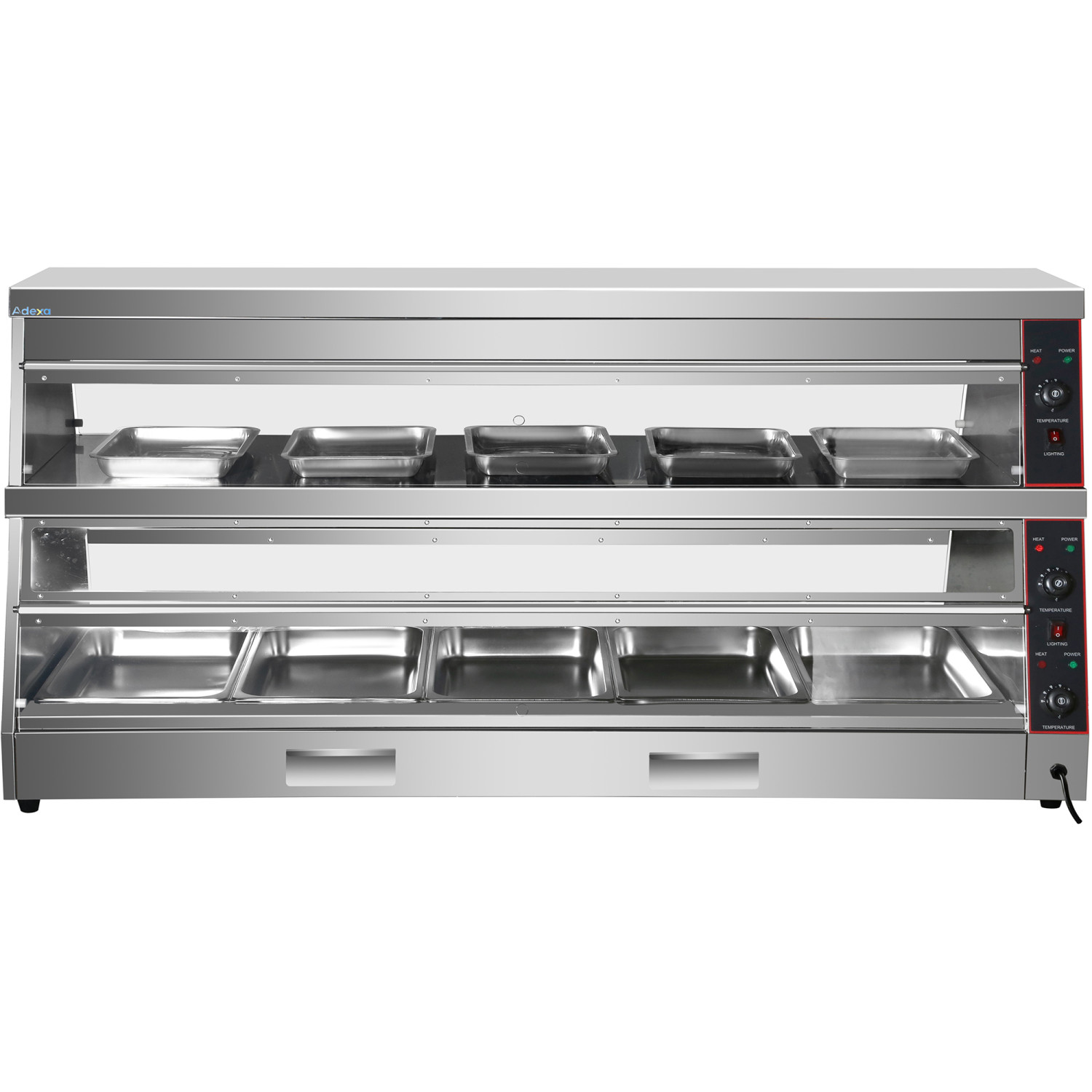 This professional two-tier hot merchandiser, with 10 trays included, is designed to hold and display a variety of hot food items, including grilled chicken, fried foods, pastries, and more, at their optimal serving temperature. Featuring a specially designed "Dry Heat" area to maintain the crispness of fried foods and a "Wet Heat" humidity zone to keep items moist and fresh, this unit ensures your food stays appetizing and ready to serve. Its compact pass-through design fits conveniently on a countertop behind the front counter, with clear see-through flip doors that provide customers with an excellent view of the displayed products. Ideal for restaurants, takeaways, supermarkets, and food stalls, this high-performance heated display unit ensures your food remains at the perfect temperature while maintaining quality and freshness.