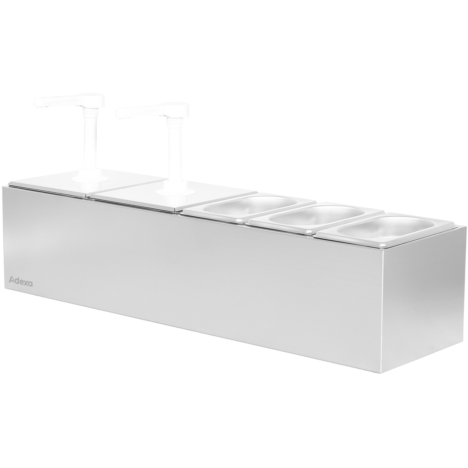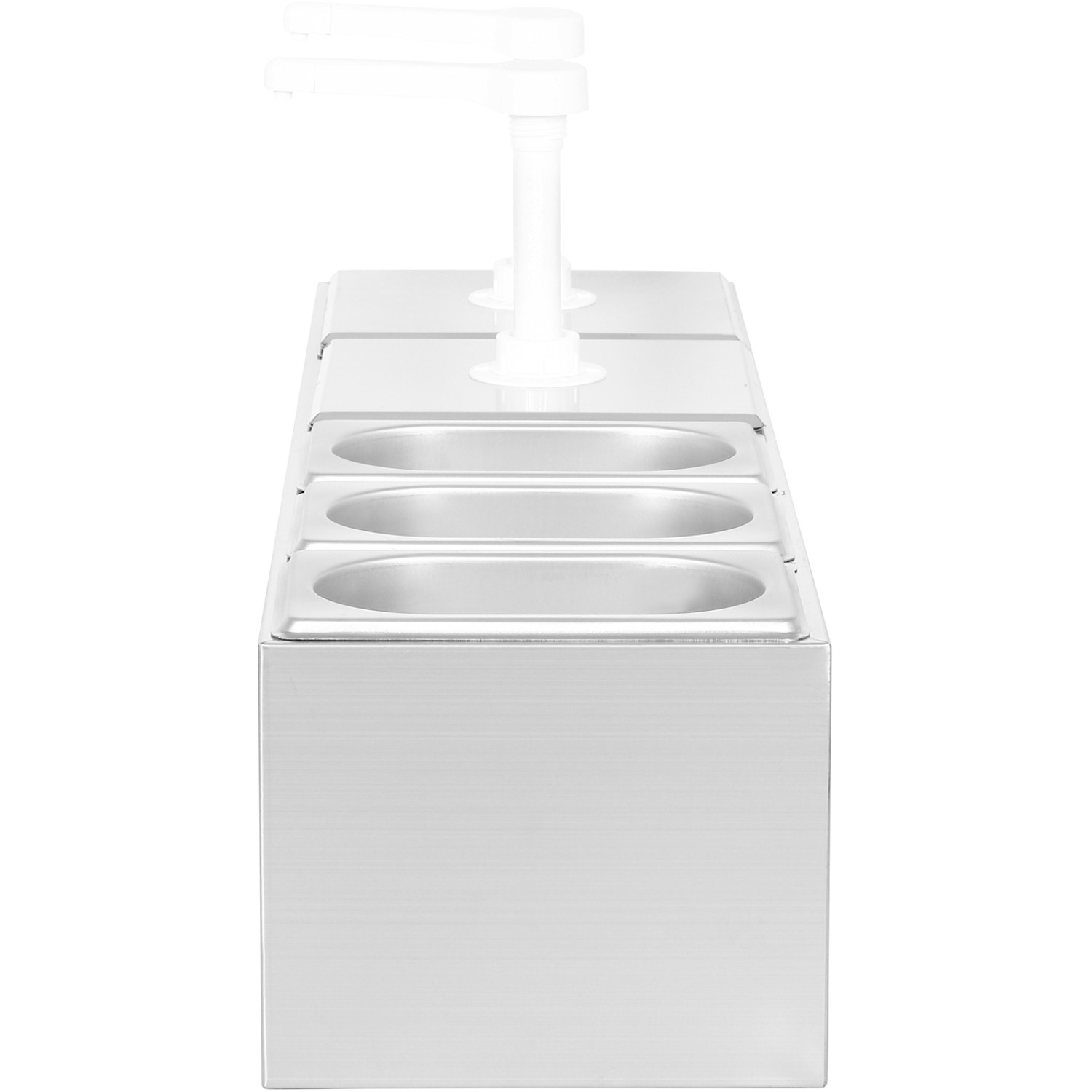 Keep your condiments organized, easy to find, and accessible with this stainless steel condiment bar! This condiment bar features 2 dispenser pumps for liquid condiments, while the single pan between them can hold up to 1.1 litres of solid condiments.