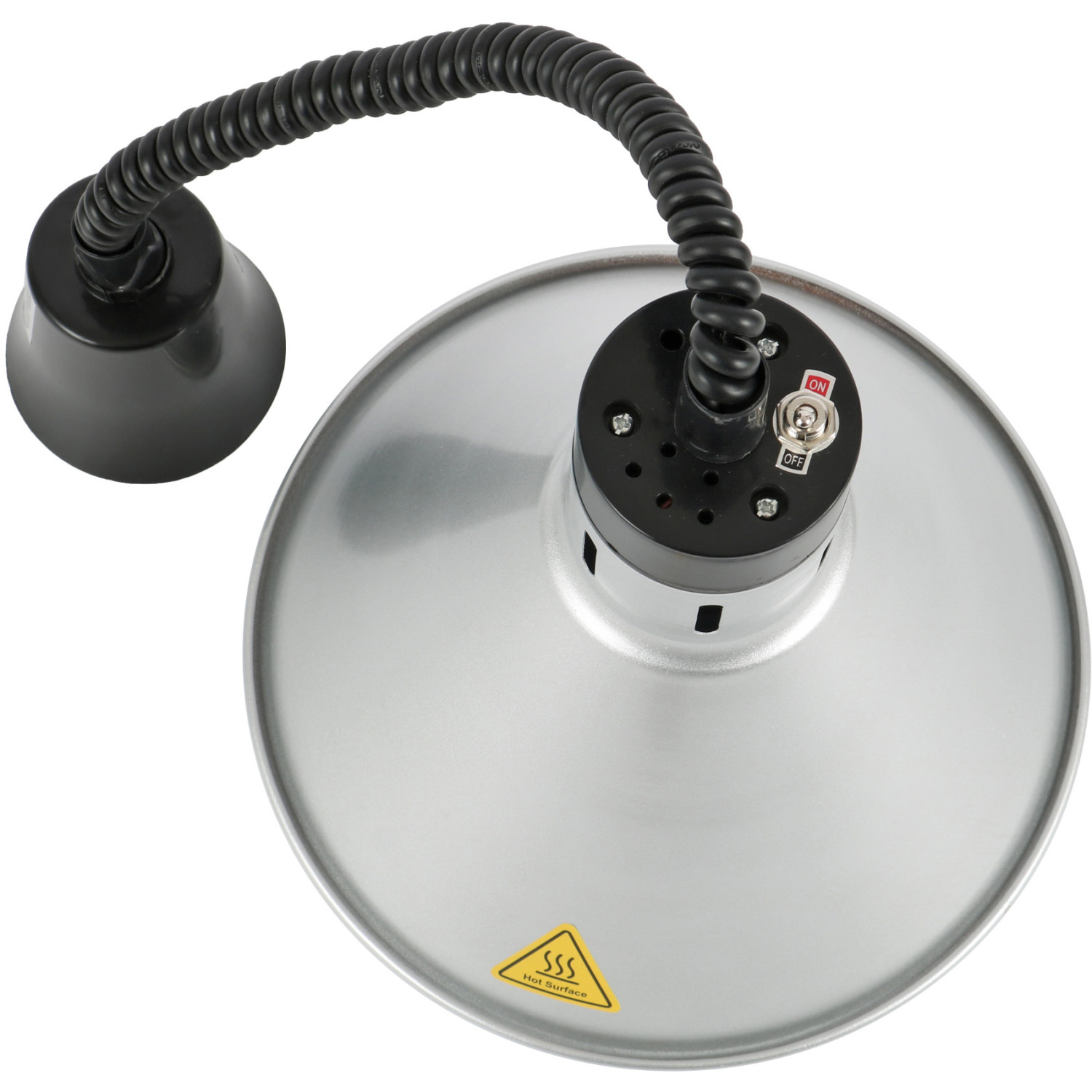This ceiling mounted commercial heating lamp with retractable cord in silver is a reliable and stylish solution for hot holding food. Ideally suited for use on the pass or in self-service buffet areas, the lamp can easily be adjusted so that food is kept appealing and at the perfect serving temperature.