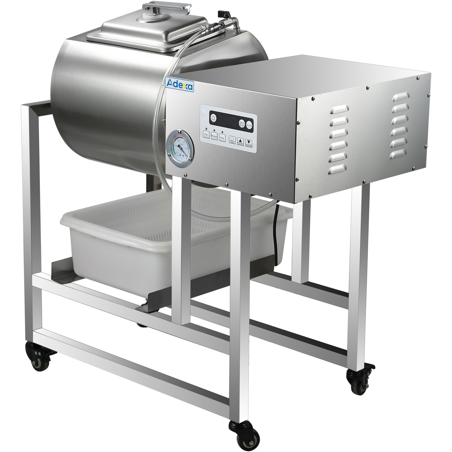 Marinade machine (also known as Tumbling Machine or Bloating Machine) makes regular foods become gourmet meals using spices, dry rubs and dressings under vacuum. It has a large capacity for large cuts of meat, whole chickens, racks of ribs, turkey breasts ets. Can be used to marinade chicken, meats, vegetables, salads and desserts.