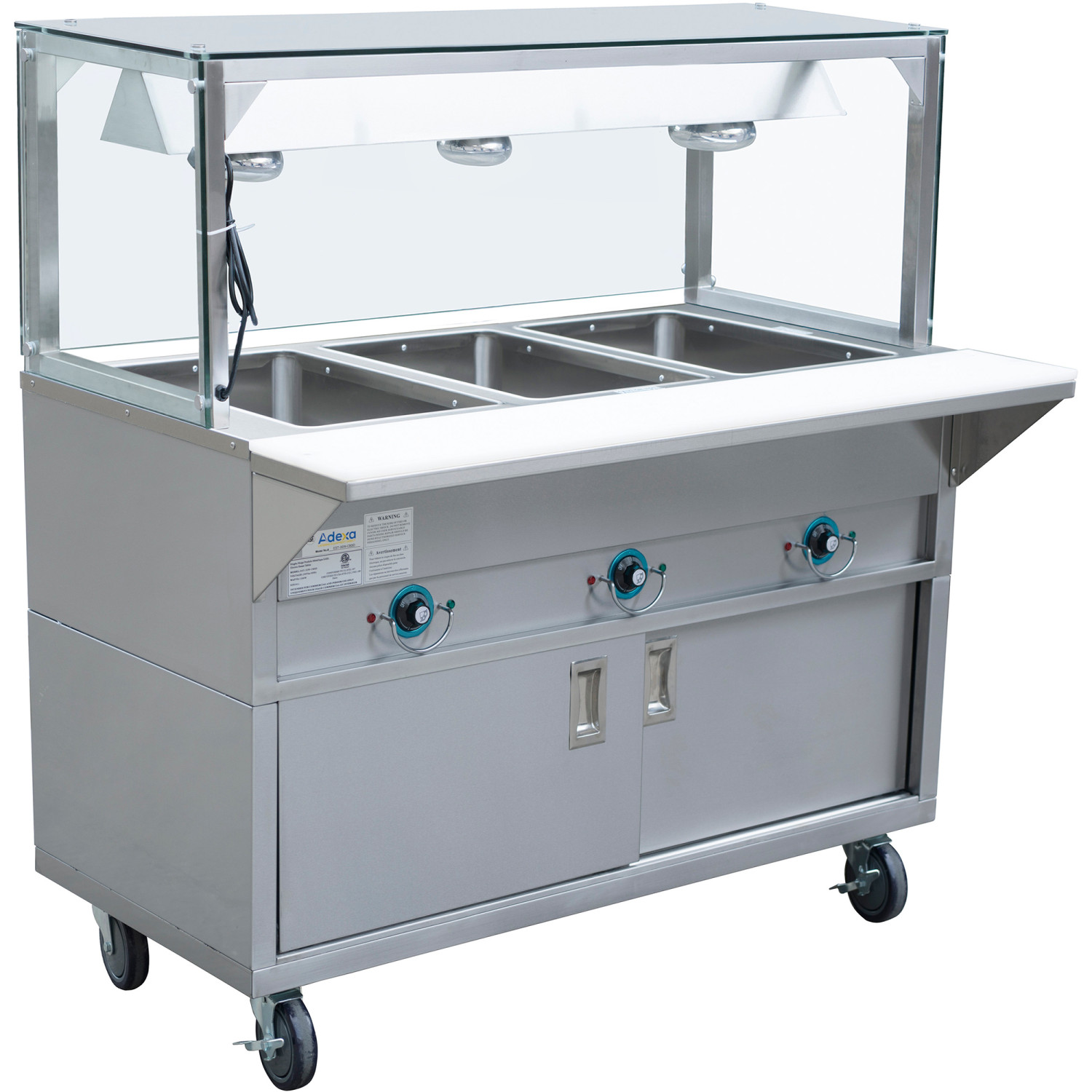 Durable, sleek, and easy to operate, this 3 pan steam table offers an incredible value to any business. Not only is it made for commercial use with a stainless steel construction, convenient cupboard, and removable cutting board. This powerful holding unit can hold 3 full size food pans full of pasta, meat, or side dishes in each well. For optimum heating versatility, each individual well is independently controlled by a control knob. Its design makes the unit perfect for special events, supermarket samples, or seasonal additions to the cafeteria line. From pasta and vegetables to chicken or beans, virtually any hot dish is easy to hold and serve in this unit.