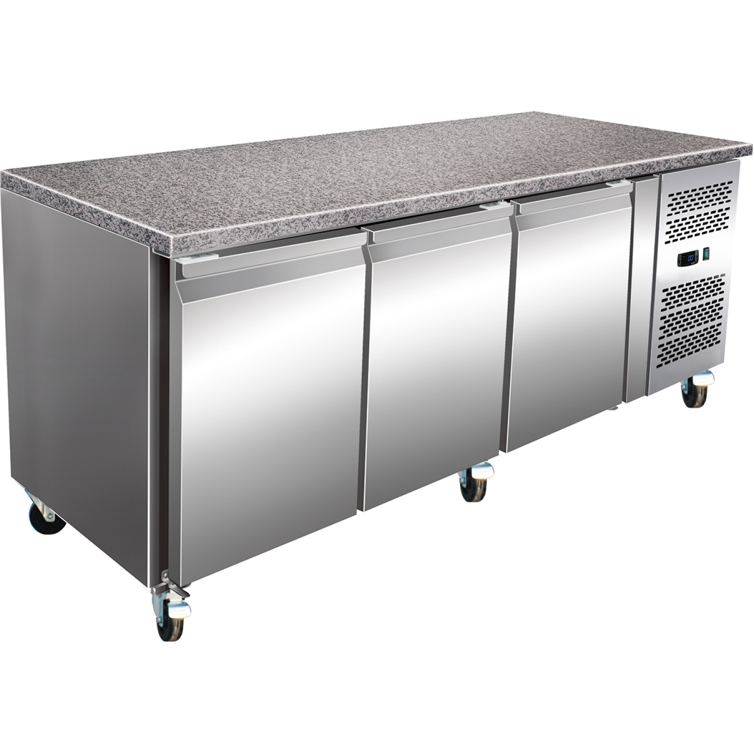 This professional prep counter offers more than enough reliable storage space for storing large quantities of rapid-access ingredients. On top, the counter features an incredibly durable and robust stay-cool marble work surface, perfect for prepping doughs for pizza or bread. Operation is simple too, thanks to the built-in digital control panel and easily adjustable shelves. A superb quality prep counter for professional restaurant and catering kitchens.