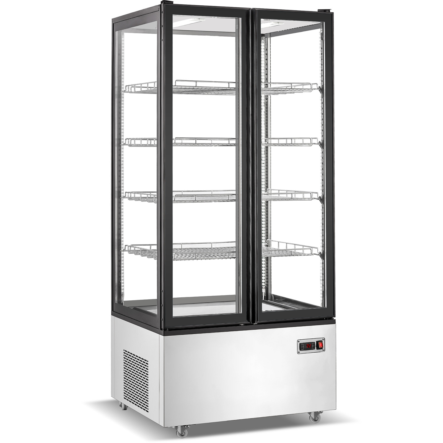 Refrigerated Display Case 600 Litres Black/Stainless Steel. This 600 litre professional refrigerated display cooler includes bright LED lighting to perfectly showcase your chilled goods. Featuring 4 shelves, digital controls and a temperature range of 0°c to +12°c, this 600 litre display case perfectly presents desserts, cakes and other chilled foods.