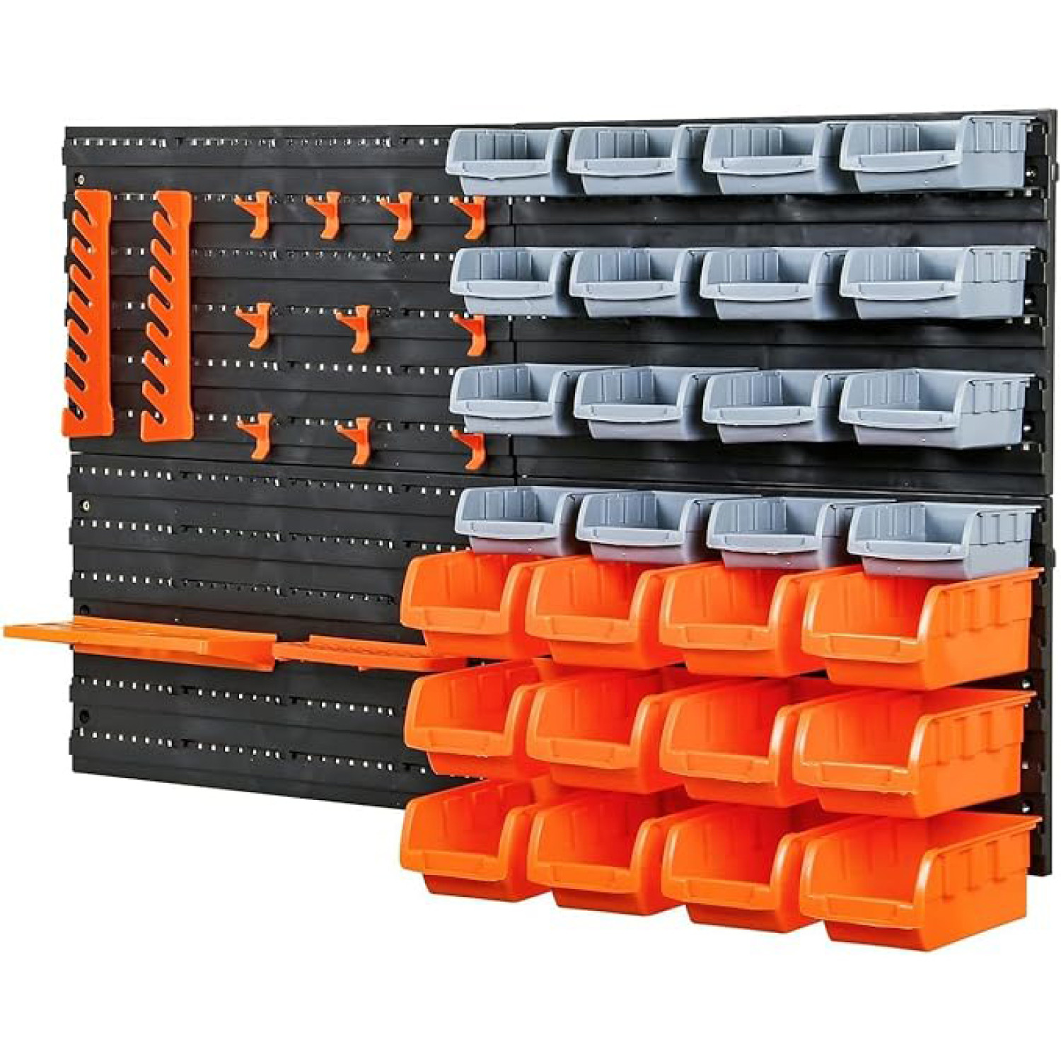 Keep your work space organised with this wall mounted storage bin organiser. Featuring 28 storage bins, 1 wrench holder, 10 hooks, 1 drill holder and a tool shelf. The two pegboard back panels can be mounted independently, to create a versatile storage solution to keep your garage, work station, office or warehouse organised and tidy.