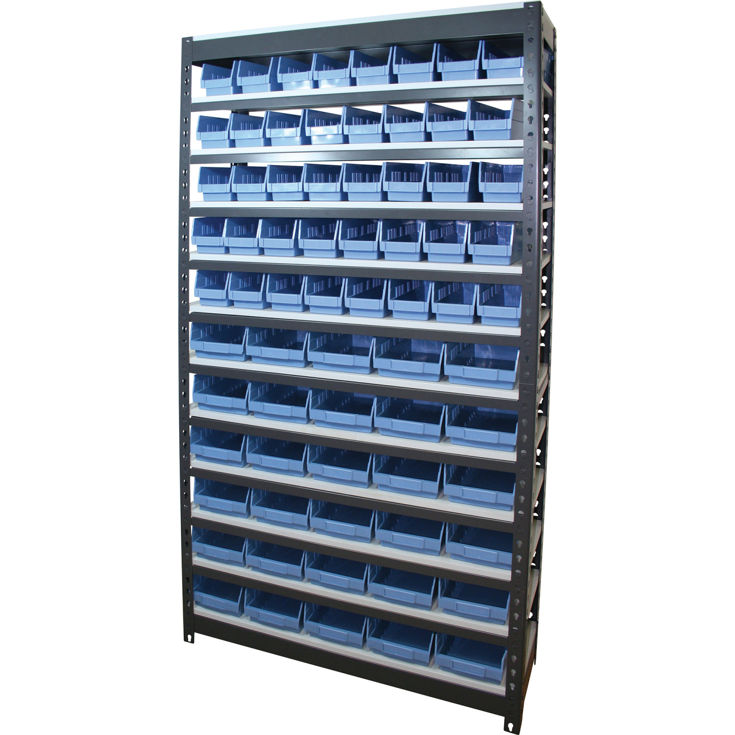 This heavy duty commercial shelving unit is perfect for storage areas, warehouses, garages or any empty wall where some extra storage would be useful. Featuring 35 plastic storage bins, this shelving unit is the ideal storage solution for small parts.