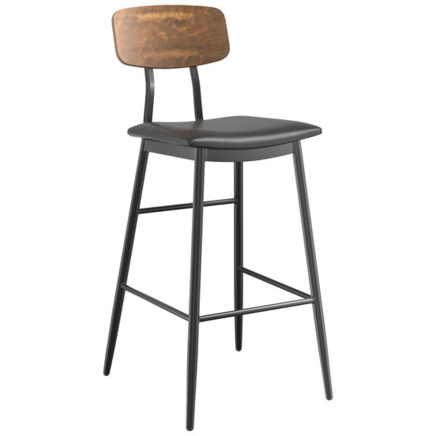 This barstool has a contemporary steel frame along with a comfortable, black vinyl seat and antique walnut backrest. This stool is perfect for both bar and raised table seating and will provide unmatched comfort while maintaining a distinct appearance. Its reliable and modern design ensures you'll be using this barstool in your pub or restaurant for years to come. This barstool is the last one you'll ever need to buy!