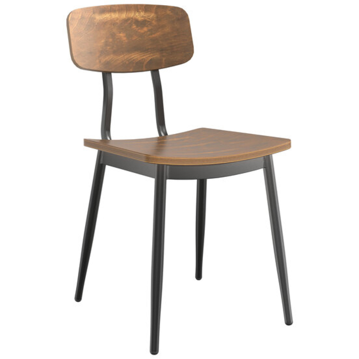 Seat your guests in comfort and style with this dining height black frame chair with antique walnut seat and back! The design is both sturdy and stylish, instilling a modern look in any location. Its reliable and modern design ensures you'll be using this standard height chair in your pub or restaurant for years to come. The back of the chair is contoured specifically for your guests’ comfort while maintaining a modern, sleek style.