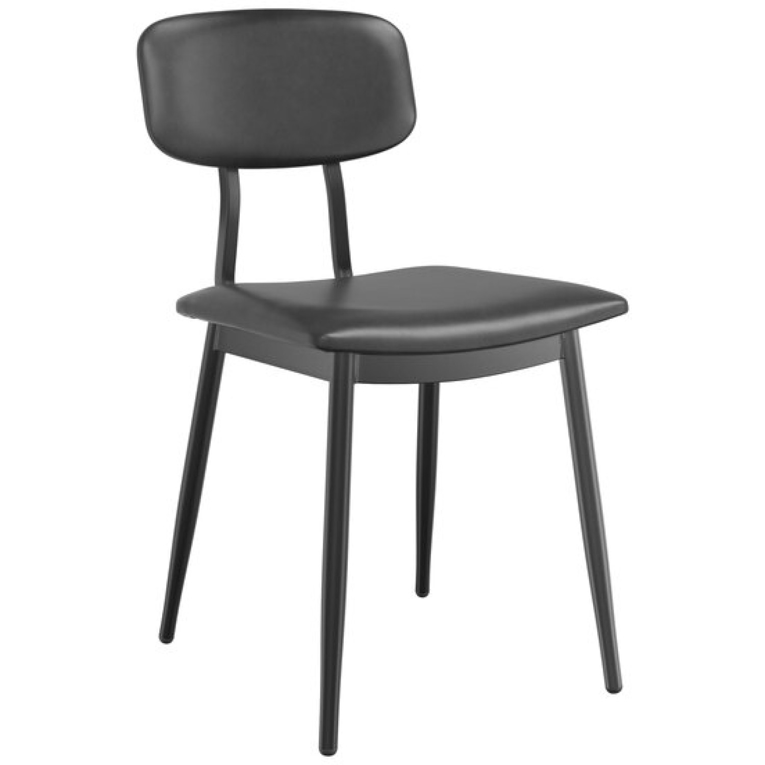 Seat your guests in comfort and style with this dining height black frame chair with black vinyl cushion seat and black vinyl back! The design is both sturdy and stylish, instilling a modern look in any location. Its reliable and modern design ensures you'll be using this standard height chair in your pub or restaurant for years to come. The back of the chair is contoured specifically for your guests’ comfort while maintaining a modern, sleek style.