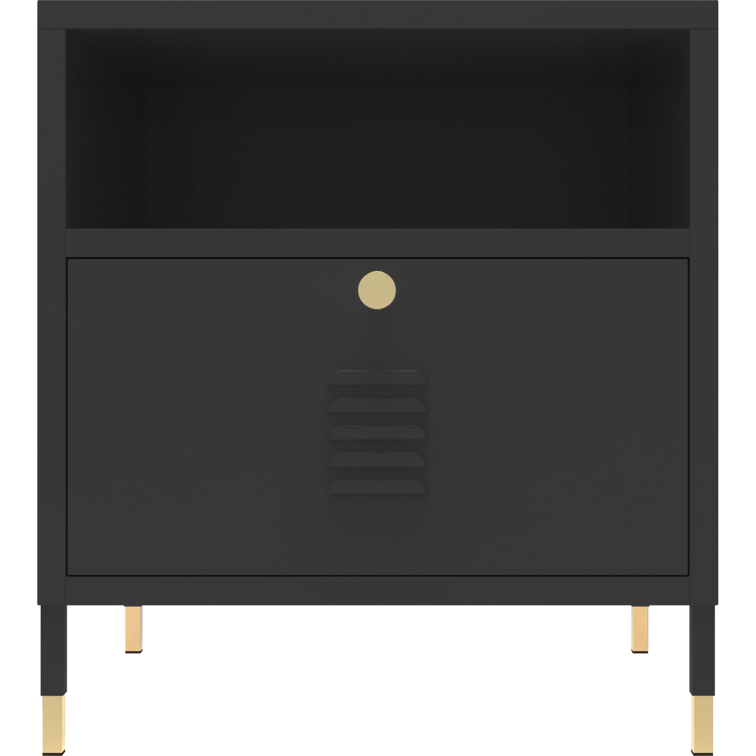 This steel night stand features a sleek black steel design with gold accents. The open cabinet top and lower cupboard provides ample storage for your bedside. A bargain at this discount price!