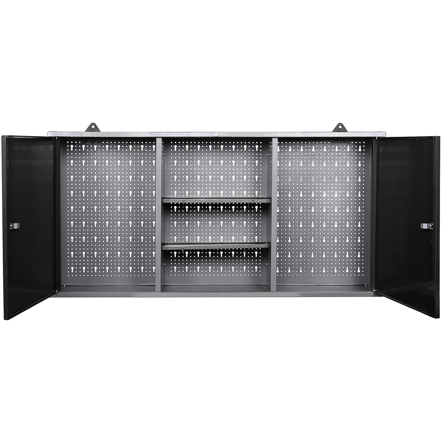 A perforated plate with euro holes enables the user to hang various kinds of tools, making it versatile for both garage and warehouse use.