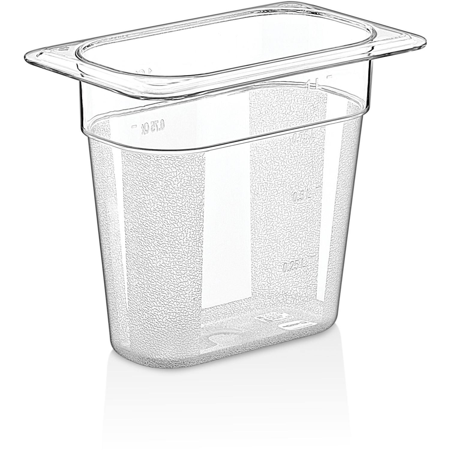 Add versatility to your kitchen with the help of this heavy duty gastronorm clear polycarbonate food pan. Made of durable polycarbonate, this pan can be added to your refrigerated prep tables or serve as a loose storage bin on your wire shelving. It's a versatile addition to your kitchen because it can be used to prep, store, transport, and serve food items. You can even use it in your steam table or at your salad bar!