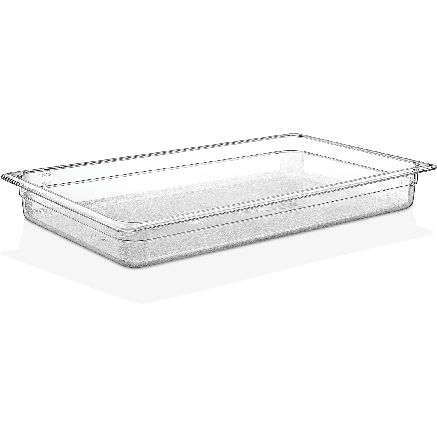 Add versatility to your kitchen with the help of this heavy duty gastronorm clear polycarbonate food pan. Made of durable polycarbonate, this pan can be added to your refrigerated prep tables or serve as a loose storage bin on your wire shelving. It's a versatile addition to your kitchen because it can be used to prep, store, transport, and serve food items. You can even use it in your steam table or at your salad bar!