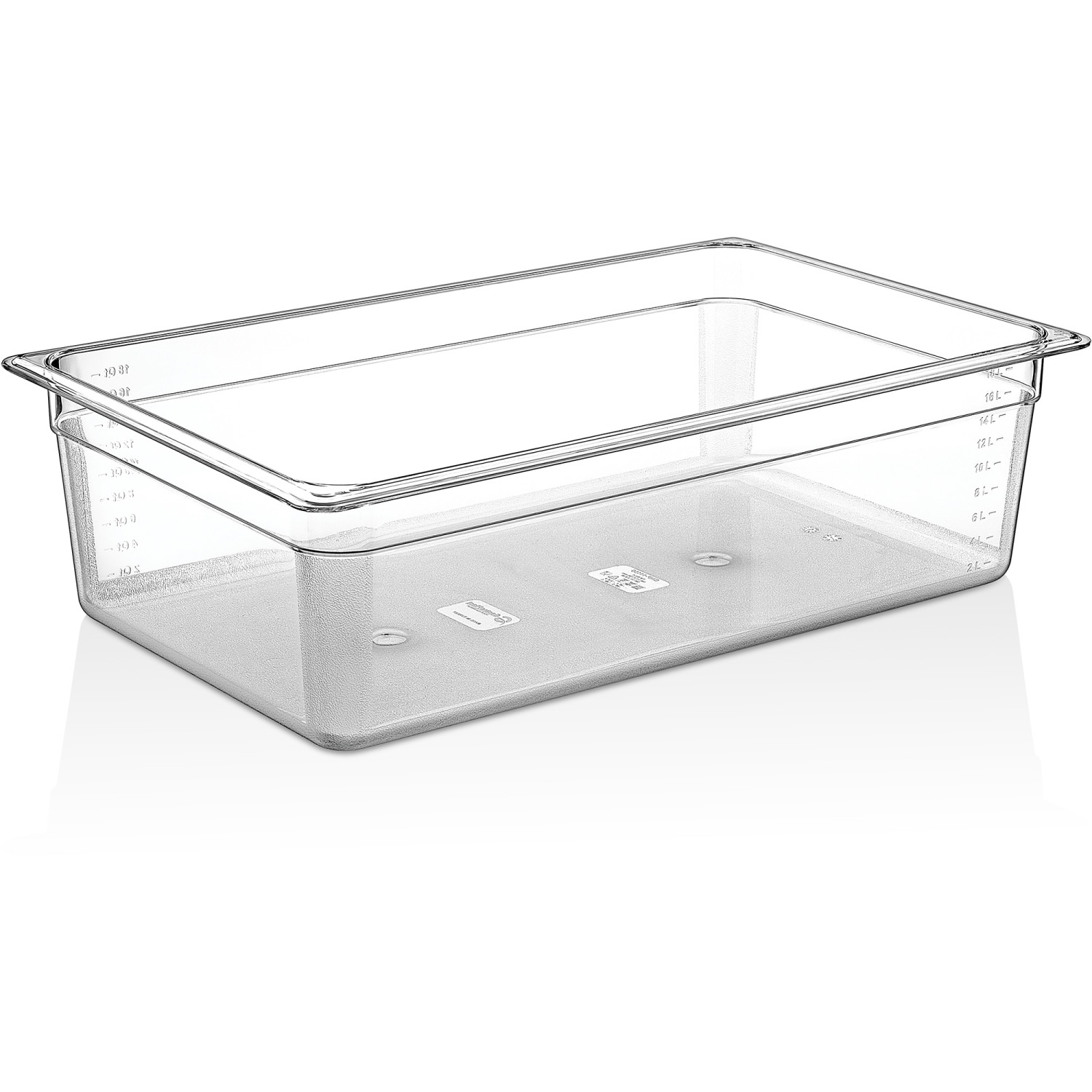 Add versatility to your kitchen with the help of this heavy duty gastronorm clear polycarbonate food pan. Made of durable polycarbonate, this pan can be added to your refrigerated prep tables or serve as a loose storage bin on your wire shelving. It's a versatile addition to your kitchen because it can be used to prep, store, transport, and serve food items. You can even use it in your steam table or at your salad bar!