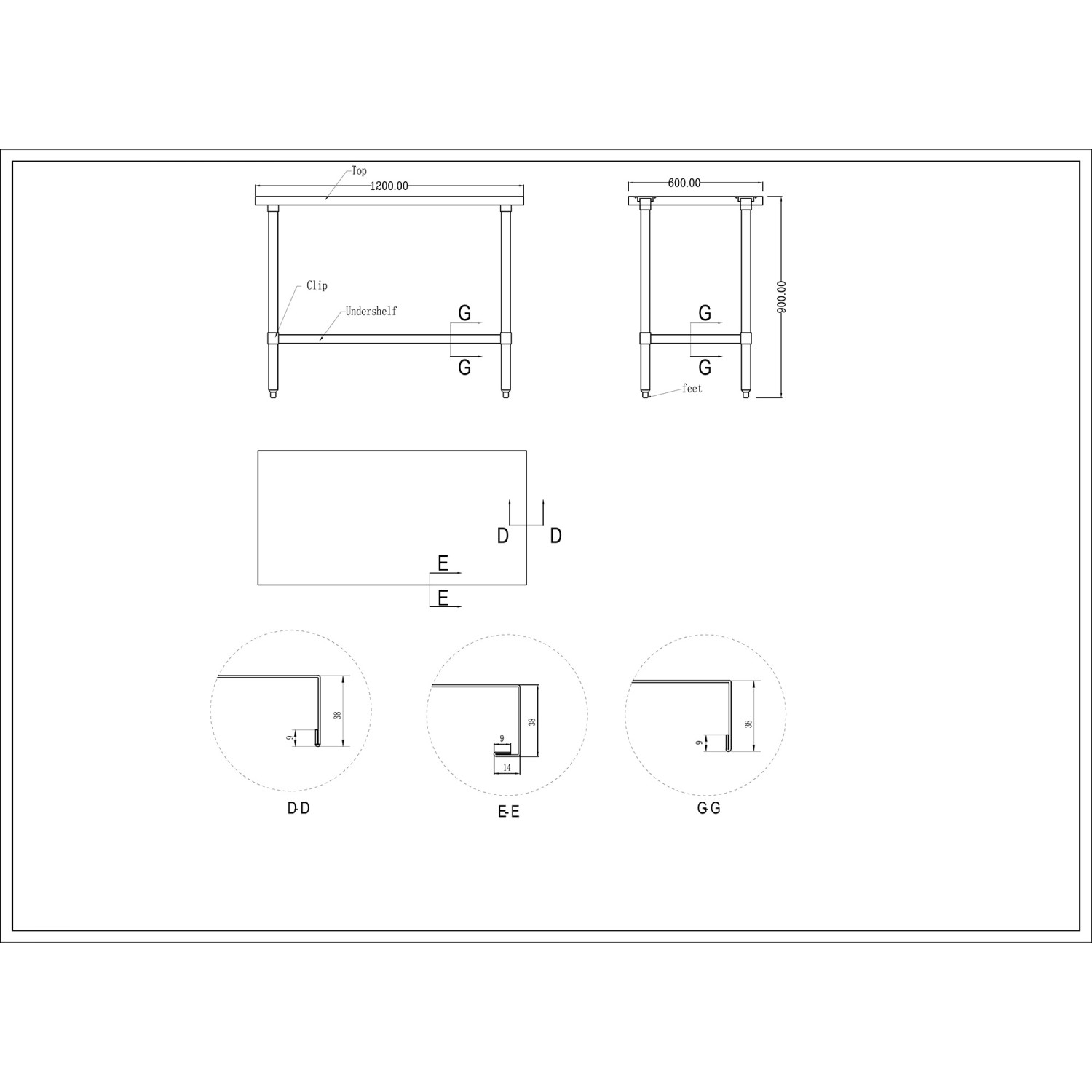 | Material | Stainless steel 1.2mm (worktop) / Galvanized steel (legs & bottom shelf) |