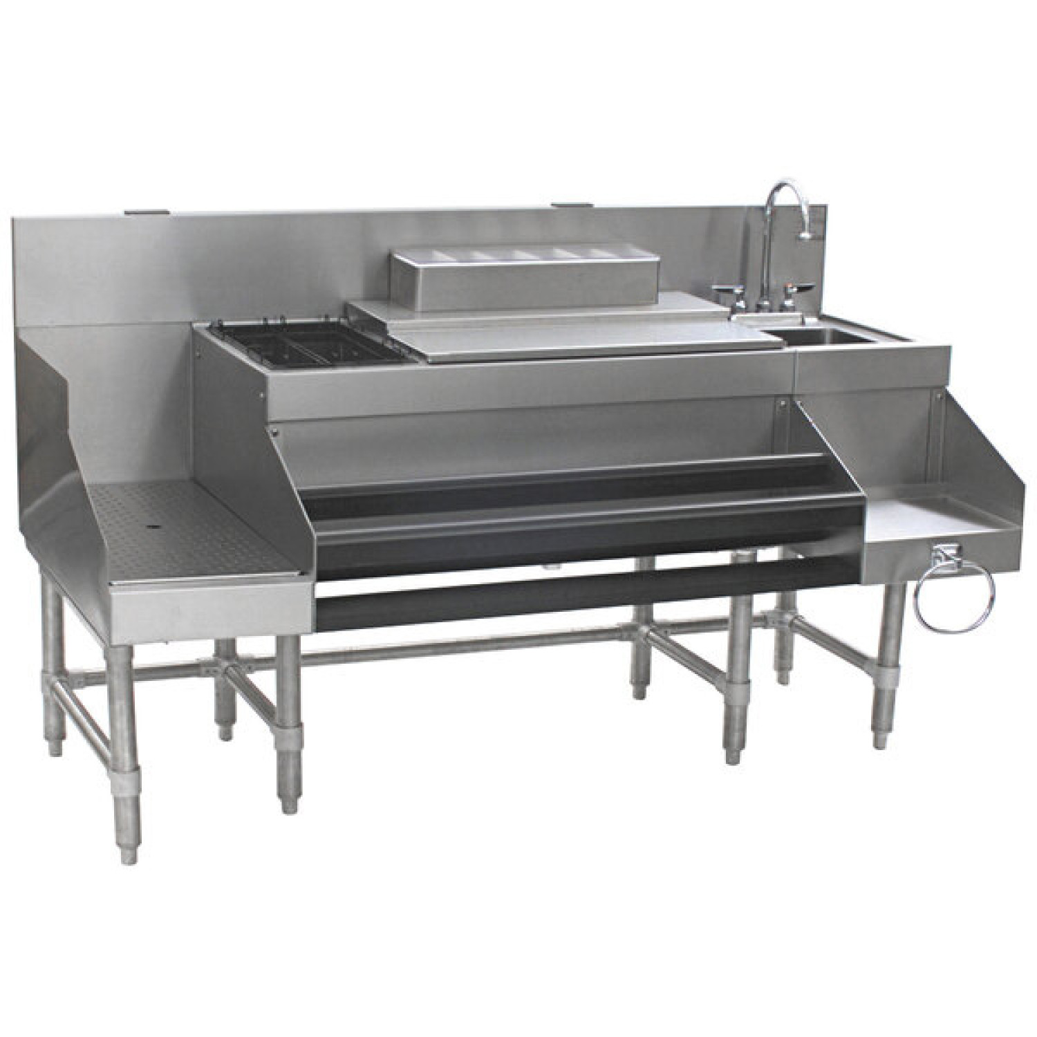 Commercial stainless steel combination cocktail station. The CECCS6012LD combination cocktail station comes equipped with multiple convenient features to ensure everything you need is in once place. With a 150mm backsplash, sink and faucet, wet waste, drain basket, speed rails and more, this cocktail station includes everything you need for a clean and efficient service. The unit includes a 915mm long ice chest and 2 ice bins, with a 38mm drain and 10cm tailpiece. The long recessed work board with drain and removable perforated insert allows space to hold glassware for draining. This professional cocktail station is sturdy and reliable, constructed from 304 stainless steel with leg support channels and bullet feet.
