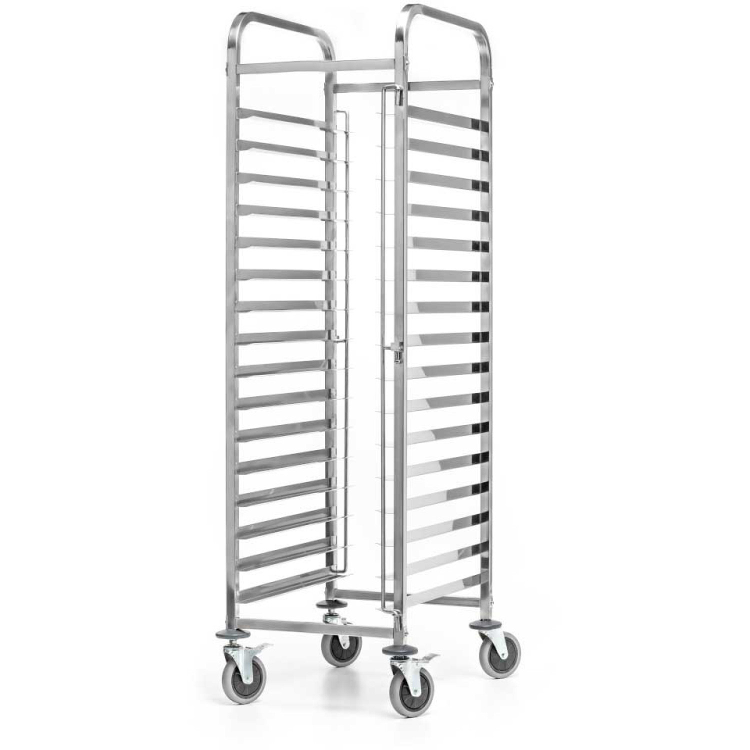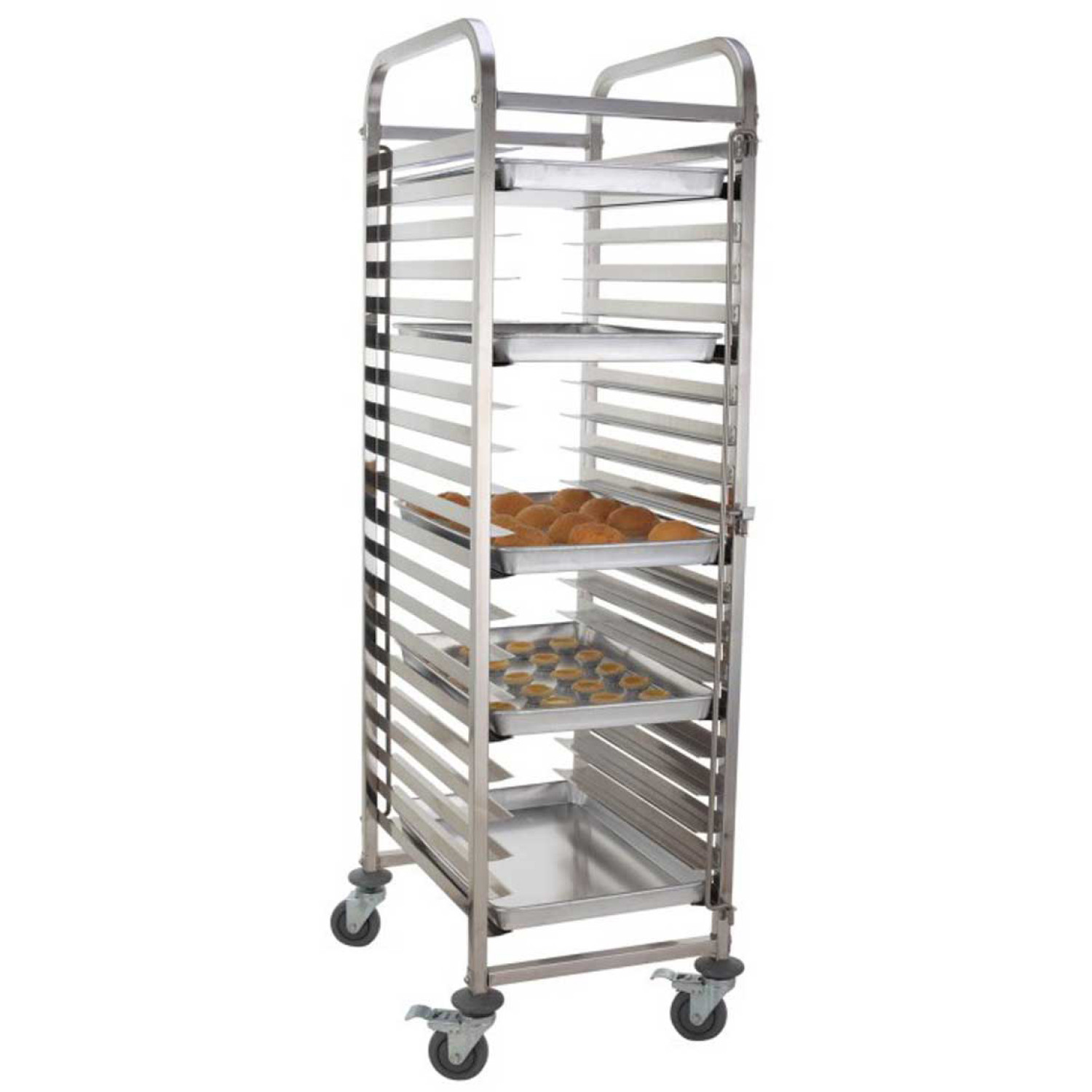 This high quality 400x600mm bakery sized professional racking trolley is ideal for stacking and storing large numbers of commercial catering trays, pans or trays. It is mounted on four castors for ease of movement.